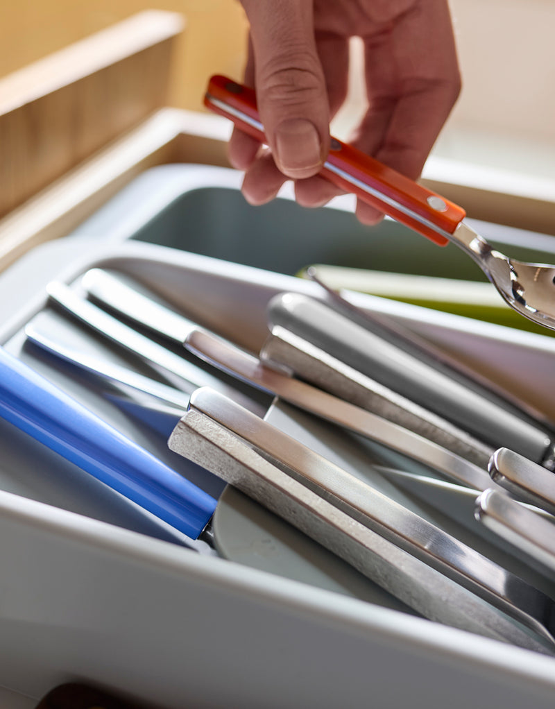 Maintenant vient la partie amusante : maintenir votre cuisine joliment désencombrée. Investissez dans des solutions de rangement astucieux comme cet organiseur de tiroir extensible pour garder les ustensiles rangés, ou des étagères pour placards pour une ambiance où chaque chose a sa place. Faites du rangement une habitude hebdomadaire (voire quotidienne), et vous ne serez plus jamais confronté au chaos de la cuisine. Pour vous faciliter la tâche, retrouvez quelques-uns de nos conseils sur la façon de maintenir vos placards de cuisine organisés et quelques-unes de nos meilleures solutions de rangement pour la cuisine.