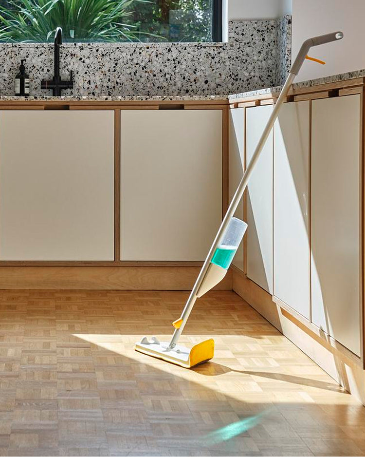 Un rapide coup de balai ou d'aspirateur est la première étape indispensable. Utilisez un balai à poils doux ou un aspirateur avec un réglage pour sol en bois afin d'éliminer la poussière, les cheveux et la saleté. La pelle et la balayette CleanStore ou le balai CleanStore de Joseph Joseph facilitent et accélèrent cette tâche grâce à leur conception murale qui les maintient à portée de main tout en les dissimulant.