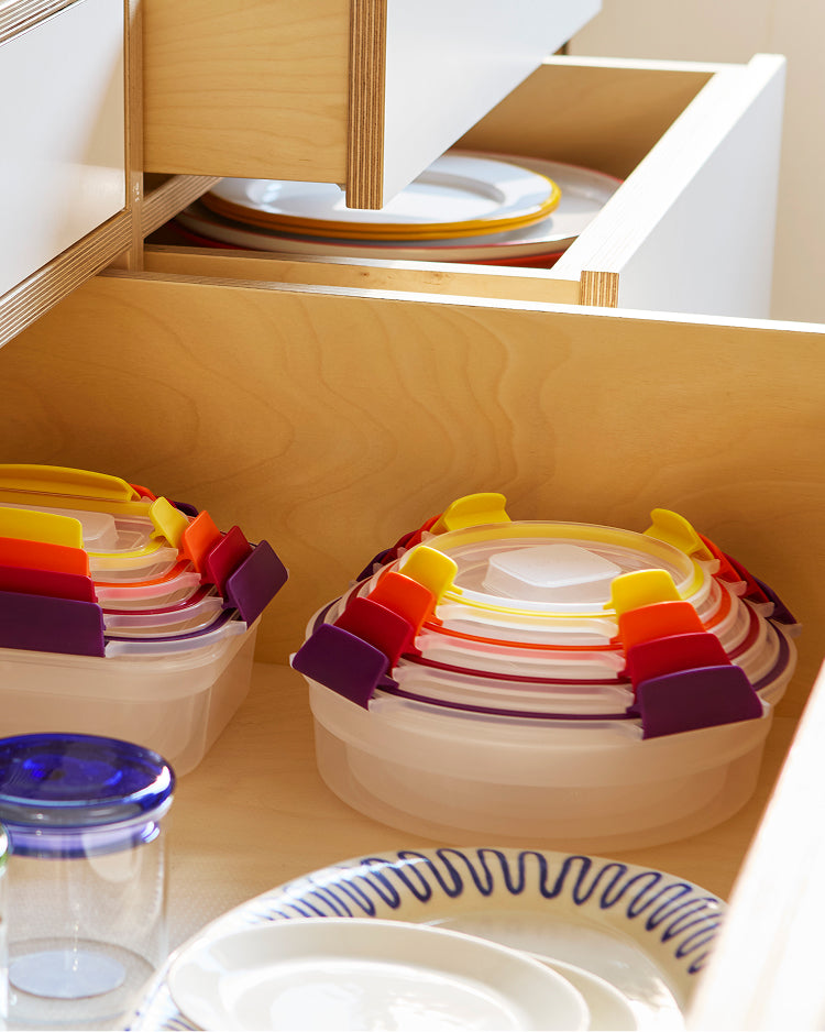 - Utilisez les contenants de rangement alimentaire Nest™ pour les currys ou les ragoûts préparés en grande quantité. Ils sont résistants au four pour la cuisson de vos plats, adaptés au congélateur pour le stockage des restes et prêts pour le micro-ondes pour le réchauffage. Et le design empilable permet de garder votre réfrigérateur ou votre congélateur bien rangés tout en simplifiant la préparation en grande quantité.