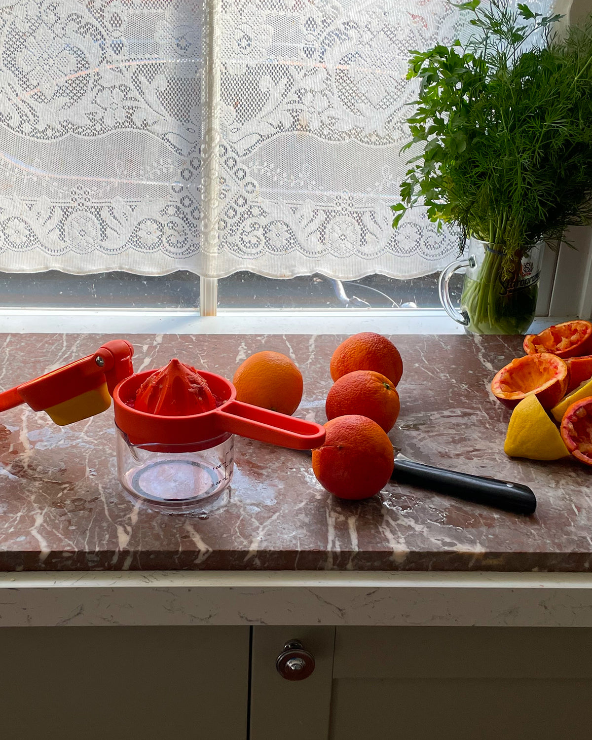- 400 ml / 420 g de jus d'agrumes - environ 5 grosses oranges sanguines et 1 grand citron