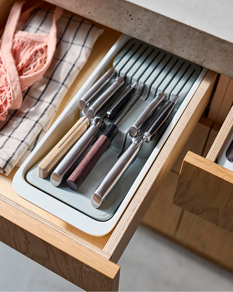 Plutôt que de les laisser éparpillés dans un tiroir, rangez vos couteaux et ustensiles dans un ensemble dédié, comme l'ensemble de 10 pièces pour tiroir Joseph Joseph, pour plus de sécurité et d'efficacité.