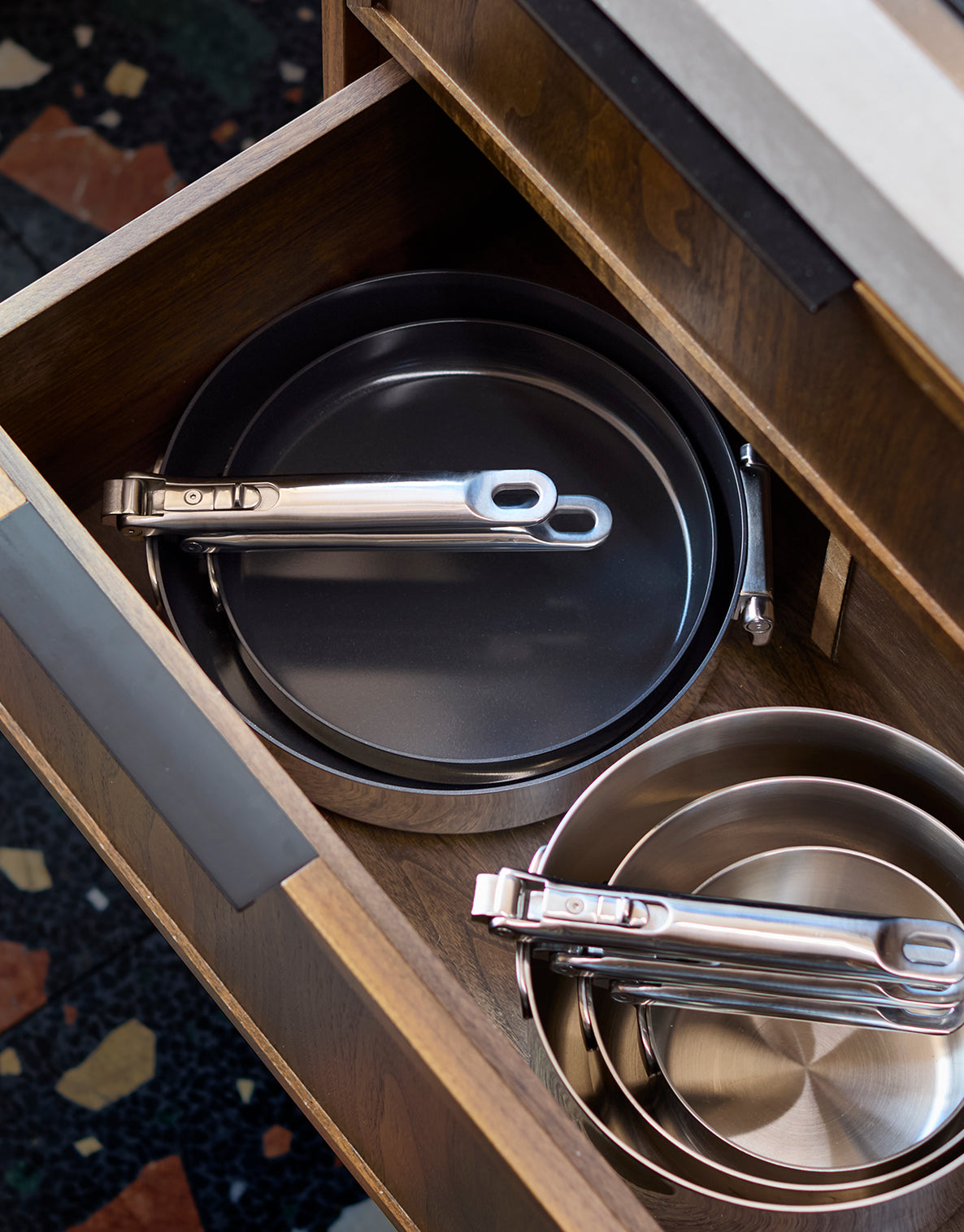 Plutôt de que de les empiler, rangez les casseroles et les poêles côte à côte à l'aide de séparateurs, afin qu'elles soient faciles d'accès et moins susceptibles de se rayer. Notre gamme d'ustensiles Space est équipée de poignées pliantes révolutionnaires qui permettent d'empiler les ustensiles sans que les poignées ne prennent de place.
