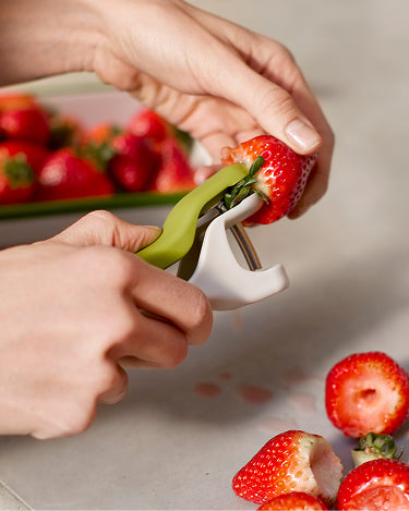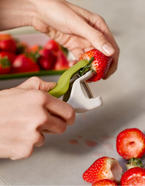 - Step 1Dénoyauter les olives et les cerises ou équeuter les fraises avec notre outil Tweezy™.