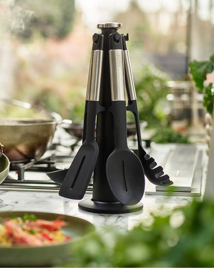 Maîtrisez l'art de l'omelette avec une spatule à fentes en silicone. Son design épuré permet de retourner facilement tout en protégeant vos poêles antiadhésives. Le carrousel de 5 ustensiles en acier inoxydable et silicone Elevate™ maintient l'ordre grâce à un repose-outil intégré sur chaque ustensile, pour éviter que les aliments ne touchent votre plan de travail. Carrousel de 5 ustensiles en acier inoxydable et silicone Elevate™.