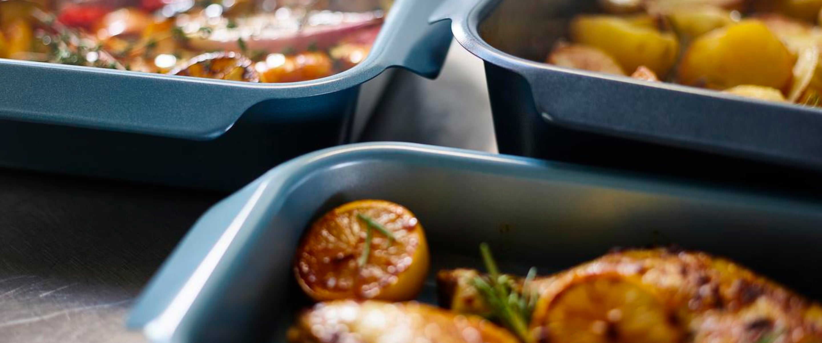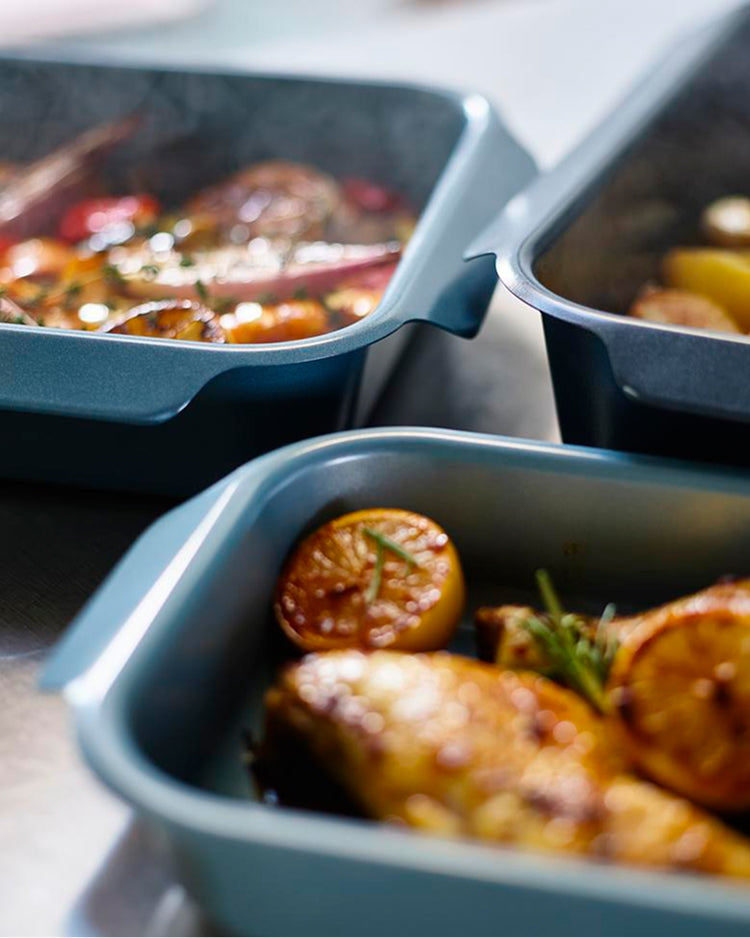 Quand on aime cuisiner, les plats à rôtir Nest™ sont indispensables. Ces plats antiadhésifs sont conçus pour obtenir une répartition uniforme de la chaleur, ce qui les rend parfaits pour les biscuits, les légumes rôtis ou les rôtis du dimanche. Les poignées faciles à manipuler évitent de toucher accidentellement vos aliments en les sortant du four. Et ils s'emboîtent les uns dans les autres pour un rangement soigné.