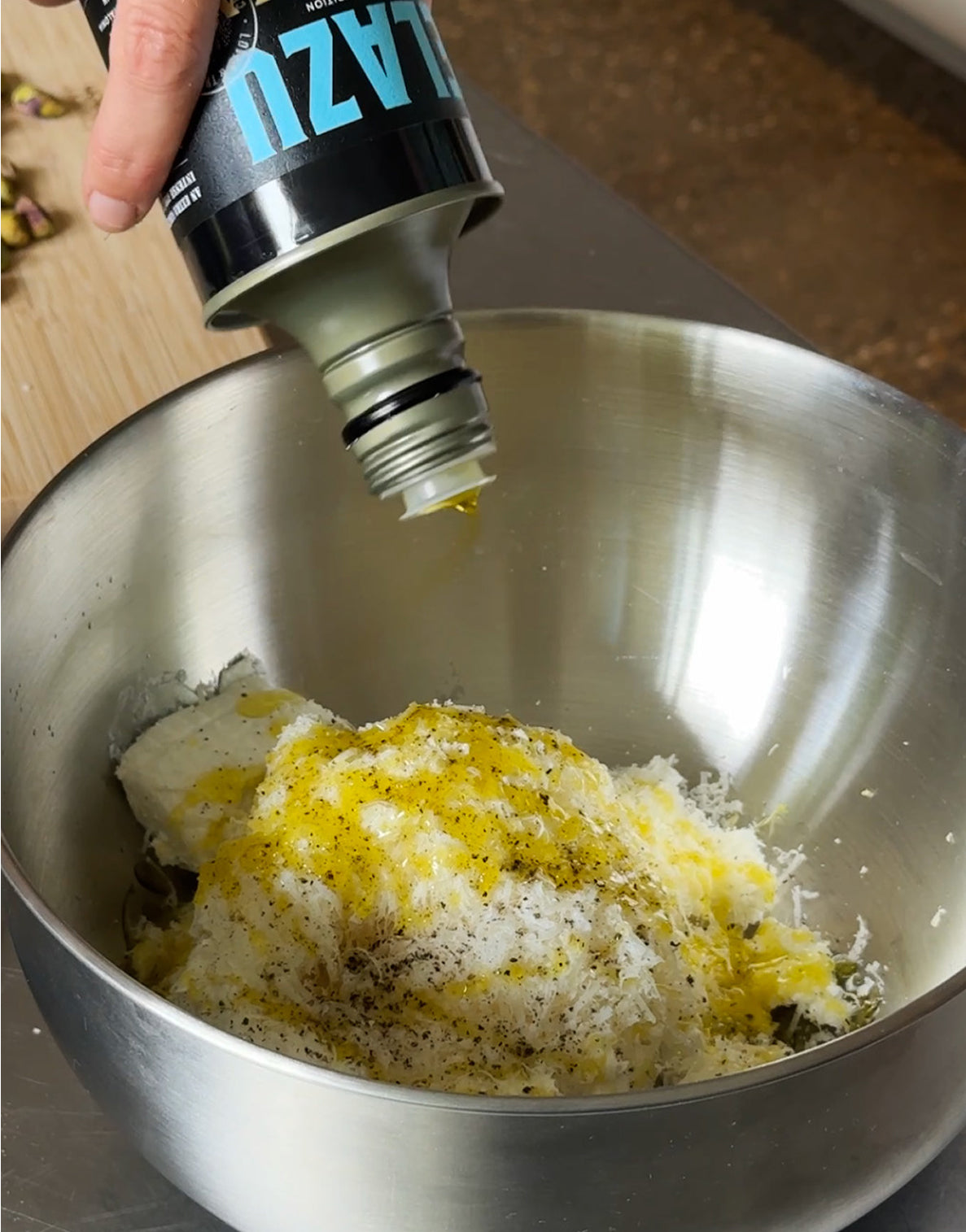 - Step 3Ajoutez tous les ingrédients à un robot culinaire et assaisonnez bien. Mélangez jusqu'à vous obteniez une consistance lisse, puis versez dans un bol de service, en garnissant avec les pistaches réservées.