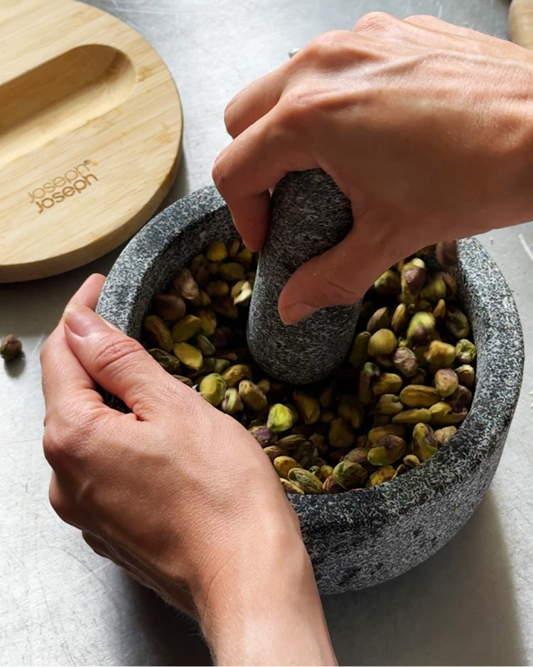 Our nifty take on a pestle and mortar features a reversible bamboo lid that protects the inside and includes a deep groove to store the pestle.