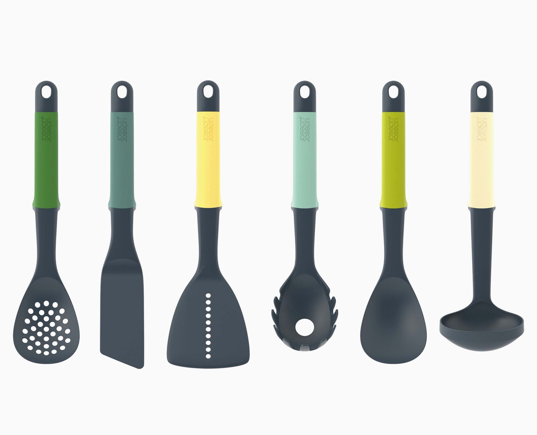 - L'ensemble dispose des éléments suivants : écumoire, louche à spaghetti, spatules à fente, flexible et pleine, louche