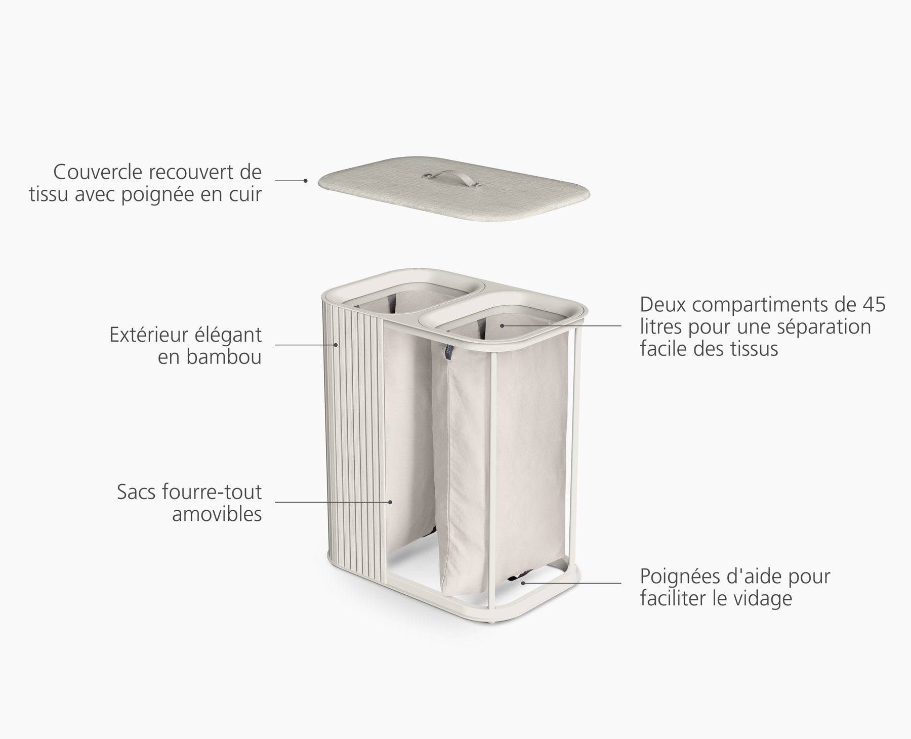 Améliorez votre routine pour le linge avec cet élégant panier en bambou écru, doté de deux sacs en tissu de 45 l pour un tri et un transport faciles. Classe et fonctionnel, il s'intègre parfaitement dans le décor de n'importe quelle chambre à coucher.